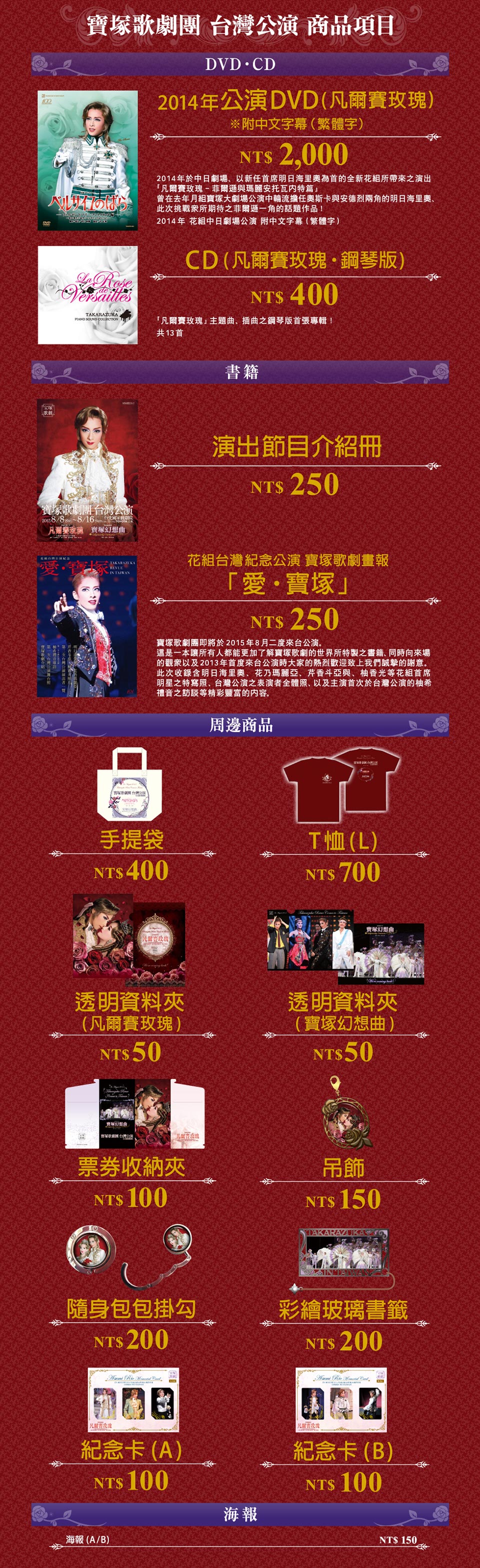 的舞台。 為了讓台灣的各位觀眾,也能沈浸於寶塚歌劇的華麗世界,本次將準備2齣自從1974年首次公演以來,已超過500萬名以上的觀眾觀賞,而號稱為寶塚歌劇財產的『凡爾賽玫瑰』、以及唯有寶塚歌劇才能詮釋的歌舞劇『寶塚幻想曲(Takarazuka Fantasia)』。希望能藉著此次的公演,為加深台灣與日本文化交流的發展,貢獻棉薄之力。此外,和前一次的公演一樣,我們也將全力以赴,讓更多的台灣觀眾得以一飽眼福。」